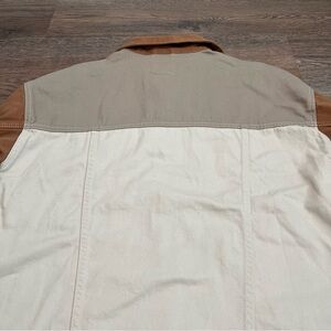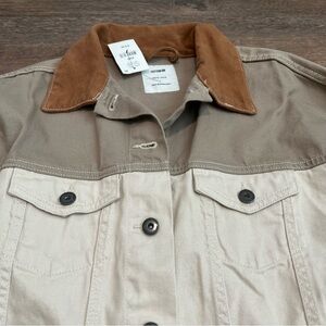 Stylish cream and brown jean jacket. Features button-up front and classic collar. Perfect for versatile wear.