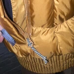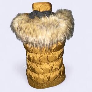Merrell puffer vest gold with removable faux fur hood trim women's size small