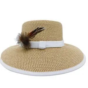 Eric Javits Squishee Raffia Ribbon Cap. Packable woven cap features a ladylike bow and ribbon trim--it's a must-have accessory for your next holiday. 4" brim. Adjustable Velcro back. White ribbon and bow above brim; contrast brim edge. This hat is customized with a deer/elk buck with antlers silver (maybe) pin with feathers. In excellent used condition.