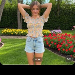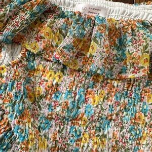 Lightweight off-shoulder top with ruffled neckline. Smocked bodice and peplum hem. Bright floral print in yellow, blue and white. Easy, feminine summer style.