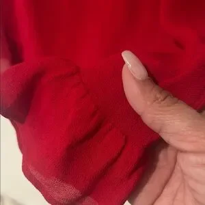 Vibrant red slip dress with tie shoulder straps. Soft drape and a subtle ruffle hem. Lightweight fabric for easy wear. Simple, elegant silhouette.