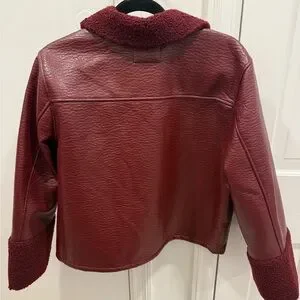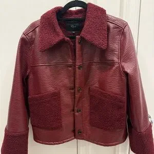 Stylish burgundy leather jacket by Rails. Features textured collar and cuffs. Button-up front with large pockets.