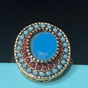 boho-style statement ring featuring a bold round blue cabochon center stone surrounded by red and turquoise-tone beaded detailing.