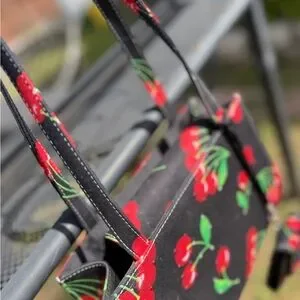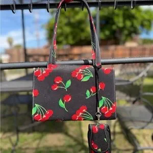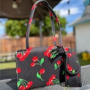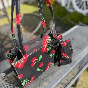 Compact black tote with bright red cherry pattern. Coordinated handles and matching pouch. Casual style for everyday use. Eye-catching green leaf accents.
