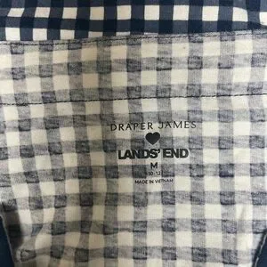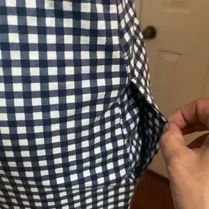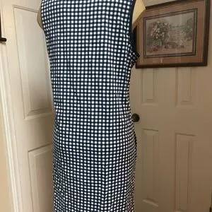 Draper James one‑piece with classic gingham pattern. V‑neck with solid navy trim. Sleek, streamlined silhouette. Easy to wear for casual get together, relaxing or beach days. Great cool little dress that has side pockets as photographed and also little slits on each side at the bottom as photographed. Really great condition. No flaws at all has a lovely stretch to it. Really sweet comfortable and soft dress! Pit to pit is 19 inches and the length from shoulder to hem is right at 33.5.