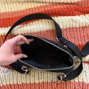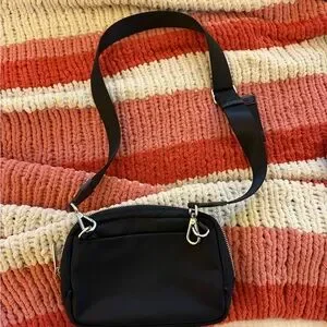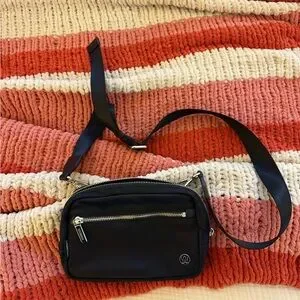 Compact crossbody from lululemon athletica. Smooth black exterior with silver hardware. Adjustable shoulder strap for hands-free wear. Front zip pocket and main zip compartment. Sleek and versatile for daily use.