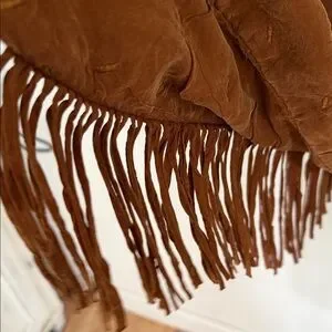 Vintage-style brown suede fringe jacket by Action Wear. Soft faux suede texture with flowing fringe detailing. Classic western-inspired silhouette. Stylish warm brown tone.