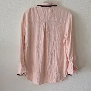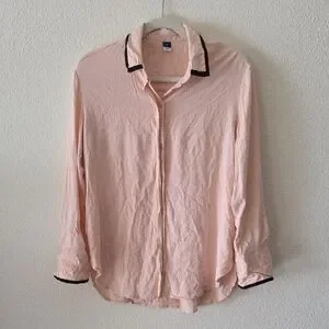 Light peach button-front blouse with black trim on collar and cuffs. Relaxed silhouette for effortless styling. Sleek, versatile look for day or night.