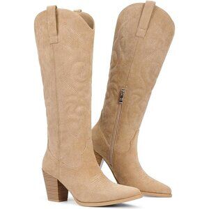 Women Khaki Suede Western Knee High Side Zipper Pointed Toe Block Heel Boot