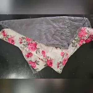 Soft lightweoghr infinity vintages scarf set. One white with bright pink floral print and the other solid gray. Lightweight, breathable fabric. Feminine and versatile accessory.