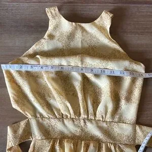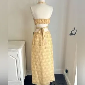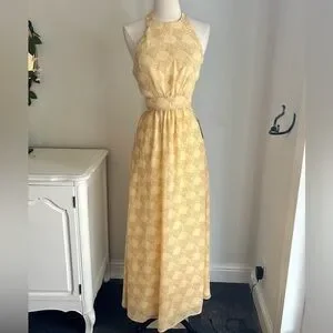 Lush Open Back Tie Waist Halter Maxi Dress in Medallion Print Yellow, Sz S NWT