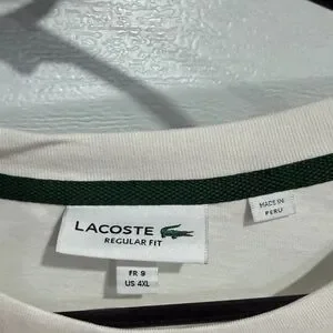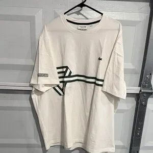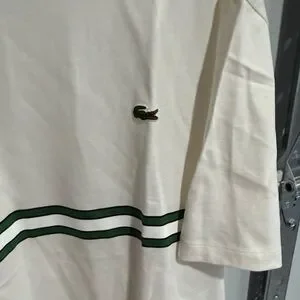 Stylish Lacoste t-shirt in cream with green stripe details. Perfect for casual outings.