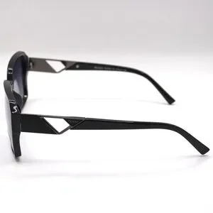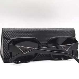 Prada women’s sunglasses featuring a bold oversized silhouette with a sleek black frame and refined gunmetal logo accents on the temples. The design delivers a modern, elevated look with strong presence.