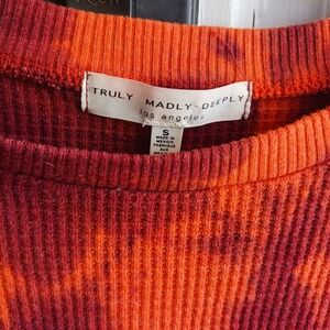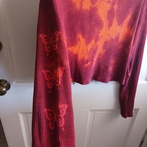 Truly Madly Deeply Red Orange Tie-Dye Cropped Waffle Knit Top Butterfly Sleeves