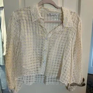 Zara button-down shirt with an all-over daisy print. Lightweight, airy fabric and relaxed fit. Classic collar and long sleeves with subtle gather at cuffs. Easy to style for casual or layered looks.