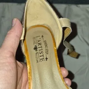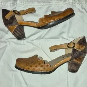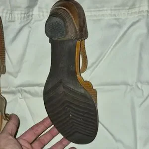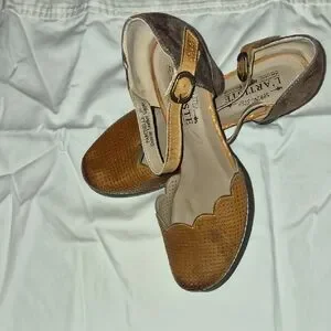 Brown leather heels with perforated scallop toe detail. Adjustable ankle strap with buckle. Padded insole for added comfort. Versatile brown tone pairs with many looks. these shoes are in great condition they have some flaws but with some leather containers the color can be cleaned up only reason its noticeable is because of the flash