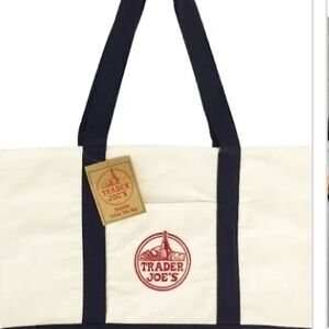 Stylish canvas tote bag with black handles and trim. Features Trader Joe's logo in red.