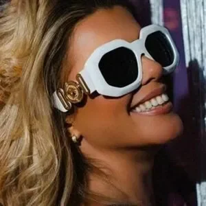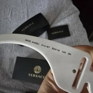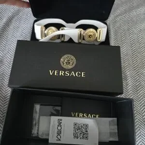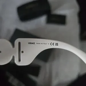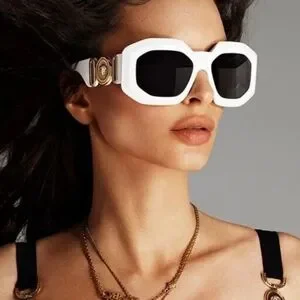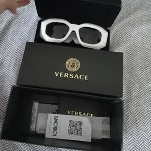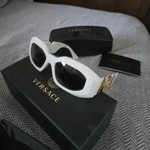 Stylish white sunglasses with iconic Versace emblem. Perfect for a modern look.