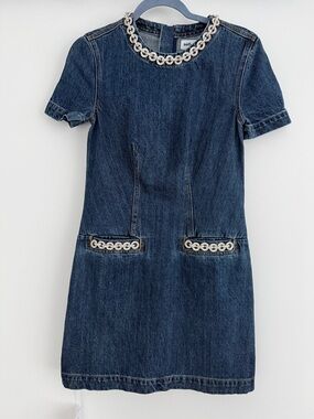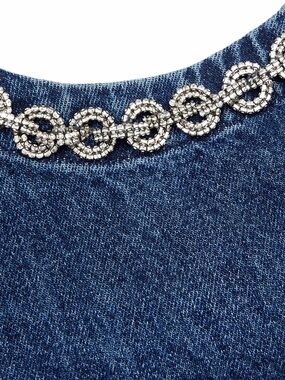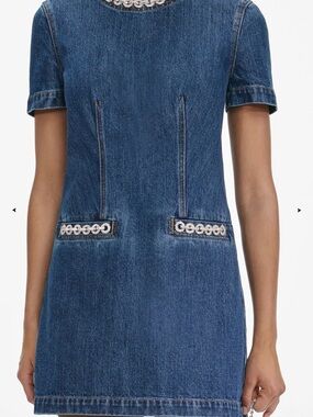 The Self-Portrait Indigo Denim Crystal Trim Mini Dress is a contemporary, fitted mini dress designed with a blend of casual denim and elevated, sparkling embellishments. It is often cited as a versatile option suitable for dinner dates or elevated casual wear.