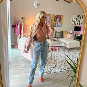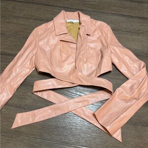 Camel faux leather wrap waist cropped blazer, worn once for a photo. Size XXS. No signs of wear