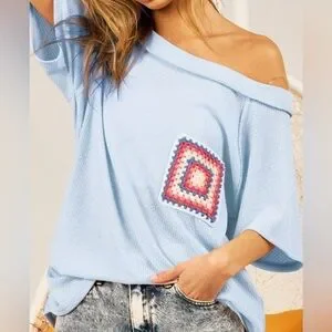 Light blue top featuring a colorful crochet pocket. Hacci solid raglan sleeve. BiBi brand.