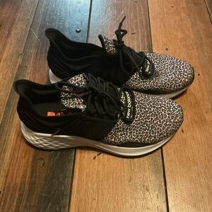 Leopard print sneakers with black overlays for a bold, stylish look. Features lace-up front and branded tongue detail. Cushioned white midsole provides comfort for all-day wear. Perfect for casual outfits or athleisure style. Great condition—ready to wear!