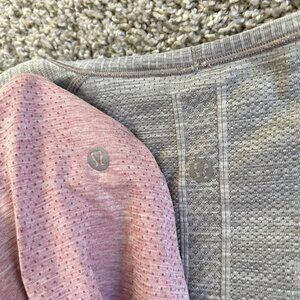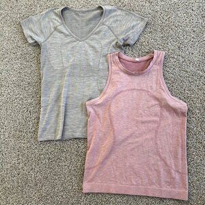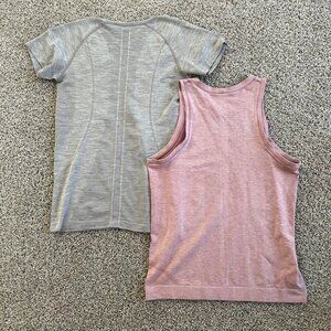 This Lululemon bundle includes a pink racerback tank and a gray short-sleeve tee. Both pieces feature breathable, sweat-wicking fabric for optimal performance.