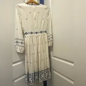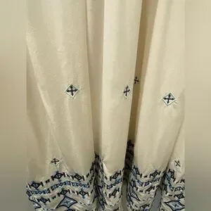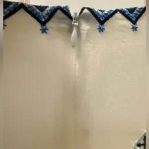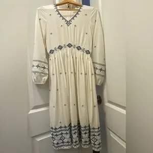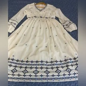 Elegant ivory dress with intricate blue patterns. Features long sleeves and a flowing silhouette. Ideal for sophisticated events.