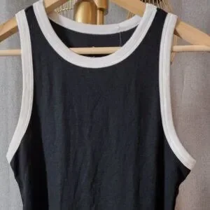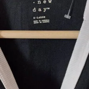 Clean, minimal staple with classic contrast white trim. Perfect for layering or wearing solo—easy everyday piece with stretch comfort.