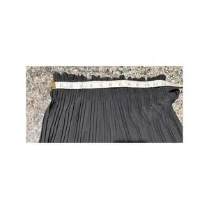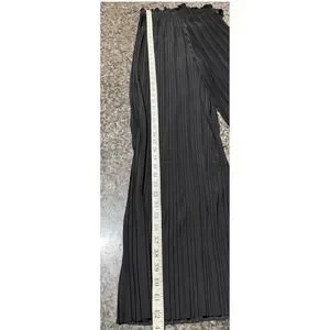 Black high-waisted wide-leg pants feature an elegant all-over vertical accordion pleat design. Crafted from a comfortable polyester-spandex blend, these trousers offer a flexible fit with a ruffled elastic waistband and a matching self-tie belt. The lightweight fabric and flowing silhouette create a sophisticated look suitable for both casual and dressy occasions.