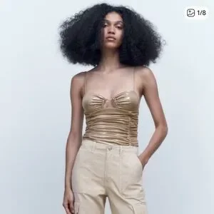 Zara Metallic Ruched Spaghetti-Strap Bodysuit in Gold