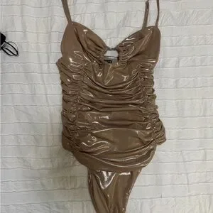 Shimmery metallic bodysuit with ruched front. Thin spaghetti straps and a subtle center cutout. Fitted silhouette that sculpts the waist. Stylish piece for evening or layered looks.