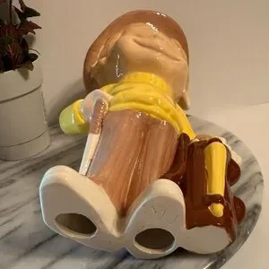 This vintage 10" ceramic figurine of a boy golfer with a bag and club features a brown hat and yellow sweater, adding a touch of charm to any collection. Hand-painted with a glazed finish, this original piece from the late 20th century is perfect for all occasions and will make a unique addition to any golfer's display. The intricate details and handmade quality make this figurine a standout piece for collectors of decorative sculptures and figurines.