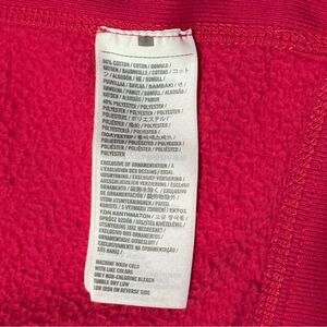 Vibrant hot pink fleece fabric. Full-zip front with hood. White drawstrings and small embroidered logo. Cozy, casual layer. Side pockets