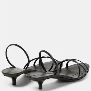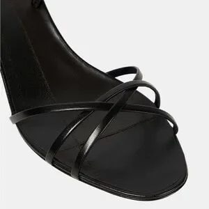 Sleek black sandals with thin crossover straps. Low kitten heel for subtle lift. Slingback strap secures the foot. Minimal, polished silhouette for refined outfits.