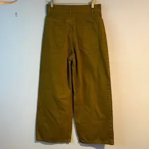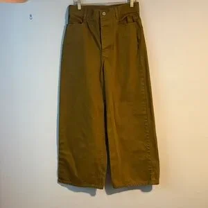 Relaxed wide leg pants in olive green with a high-rise waist. Durable fabric for everyday wear. Clean front and wide leg for easy styling. Versatile color pairs well with neutrals and bold tops.