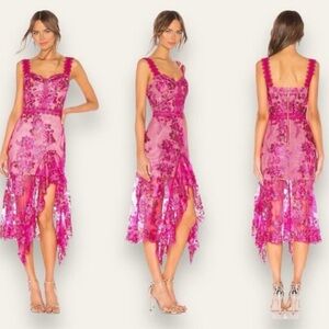 Bold fuchsia pink floral embroidery on sheer midi fabric. Feminine silhouette with a front slit. Intricate appliqué detailing throughout. Elegant and eye-catching party dress.