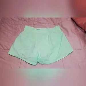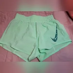 Nike women's athletic shorts in a mint green color. Lightweight, breathable fabric for comfortable workouts. Elastic waistband for a secure fit. Subtle Nike logo for sporty style.