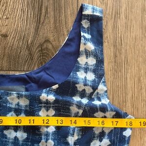 This charming ModCloth fit and flare dress features a vibrant blue and white geometric ikat-inspired print. It is designed with a classic scoop neckline, a defined waist leading to a gathered skirt, and functional side pockets. The lightweight fabric is fully lined for comfort and features a discreet side zipper closure. Perfect for spring events, brunch, or a casual summer day. Note: There is a small area where the stitching is starting to open (see photos), easily repairable.