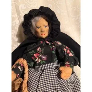 Meet the centerpiece of your shelf display! This charming vintage handmade folk art doll captures the spirit of a traditional village grandmother. From her hand-painted expression to her tiny hand-woven wicker basket, every detail is full of personality.