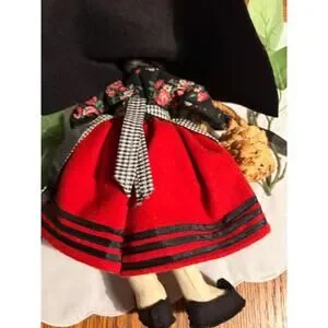 Details: Dressed in a floral bodice, gingham apron, and a red-striped skirt, topped with a soft black felt cloak and bonnet.