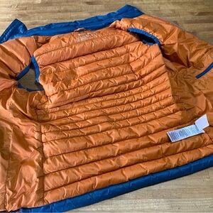 cotopaxi Teal Packable Down Vest with Blue and Orange Stripes