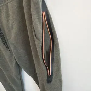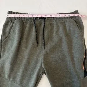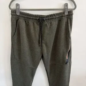 Comfortable and easy to wear, these Burnside mens jogger pants are a great everyday athleisure staple. Made from soft 100% polyester in a heathered olive green, they feature an elastic drawstring waistband, banded cuffs, and a sleek zip pocket with orange accent trim along the side. Style BG8531 in mens size Large, perfect for lounging, workouts, travel, or casual wear. See measurements below to ensure a great fit.