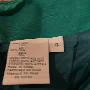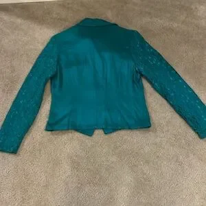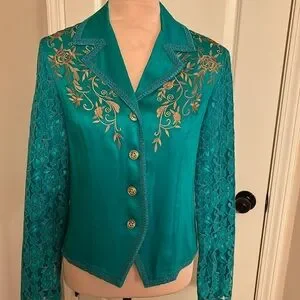 Vintage Together turquoise two-piece pantsuit. Size 4. 100% rayon. Excellent condition. Lace sleeves with lining. Gold floral embroidery on breast. Button down jacket. Gold embellished buttons. Pants have zip fly button front. two packets in front. Dry clean only. Jacket measurements: 19 inches pit to pit. Jacket length is 22 1/2 inches from top of shoulder to points. Sleeve length from back of collar is 33 inches. Pants measurements: inseam is 28 inches. Waist is 26 inches. All measurements are approximate.