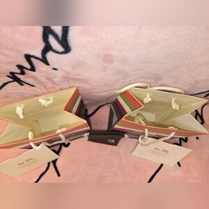 Set of two Coach striped gift bags with 2 envelopes for care cards also includes small brown Coach dustbag. Gold logo accents on bags and pouch. Bright multicolor stripes. Great for gifting or display.