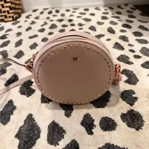 Elegant round crossbody bag in blush. Features gold stud detailing. Perfect for adding sophistication to any look.
