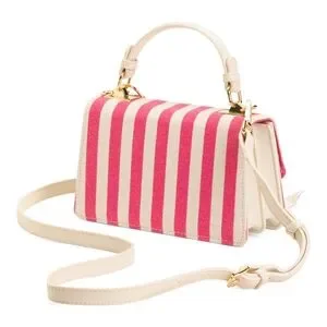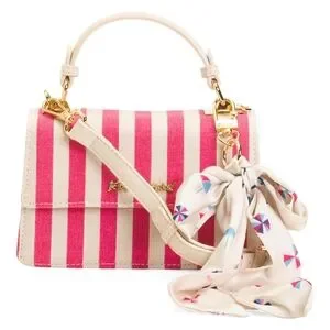 Chic satchel with bold pink and cream stripes. Features a playful scarf accent. Ideal for a stylish look.