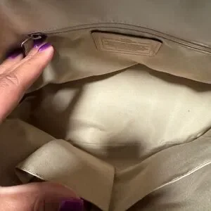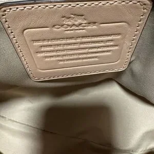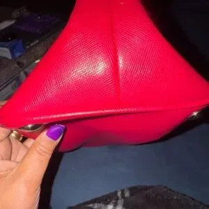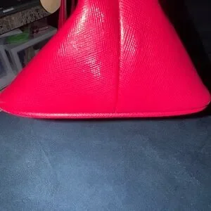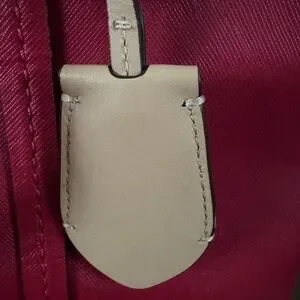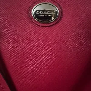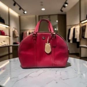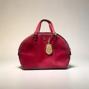 Structured dome satchel in rich red-pink leather. Dual top handles and zip-top closure. Includes detachable tan leather luggage tag and subtle Coach hardware. Sleek, everyday style with a polished finish.