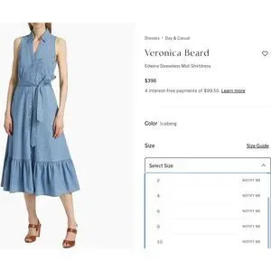 Veronica Beard NWOT Women 10 Edwina Sleeveless Midi Shirtdress Iceberg Denim