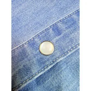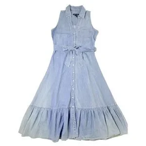This designer denim shirtdress features a collared neckline and a full button front. It includes a matching tie belt to cinch the waist and a feminine flounced ruffle hem. The lightweight chambray fabric makes it a versatile piece for year round wear.
